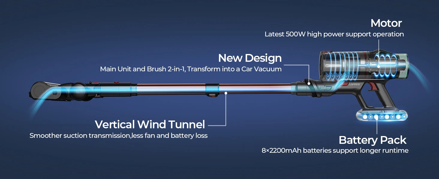 Laresar V7 PRO är en uppgraderad version av Laresars V7-dammsugare, som huvudsakligen har tillbehör som ett långt sugrör och soffsug, samt aromaterapifunktioner. Dessutom har vi uppgraderat motor- och batteritekniken hos V7 PRO-dammsugaren!
